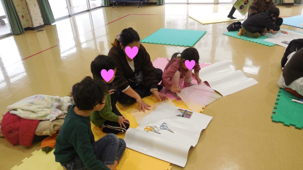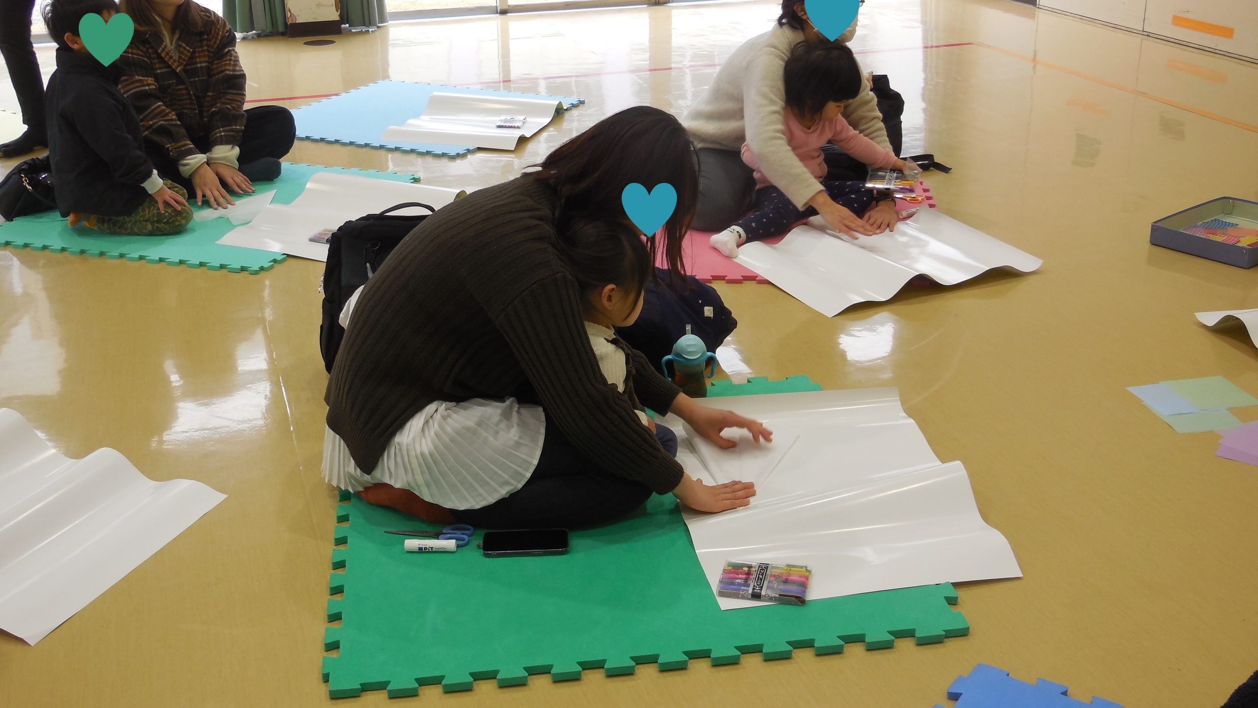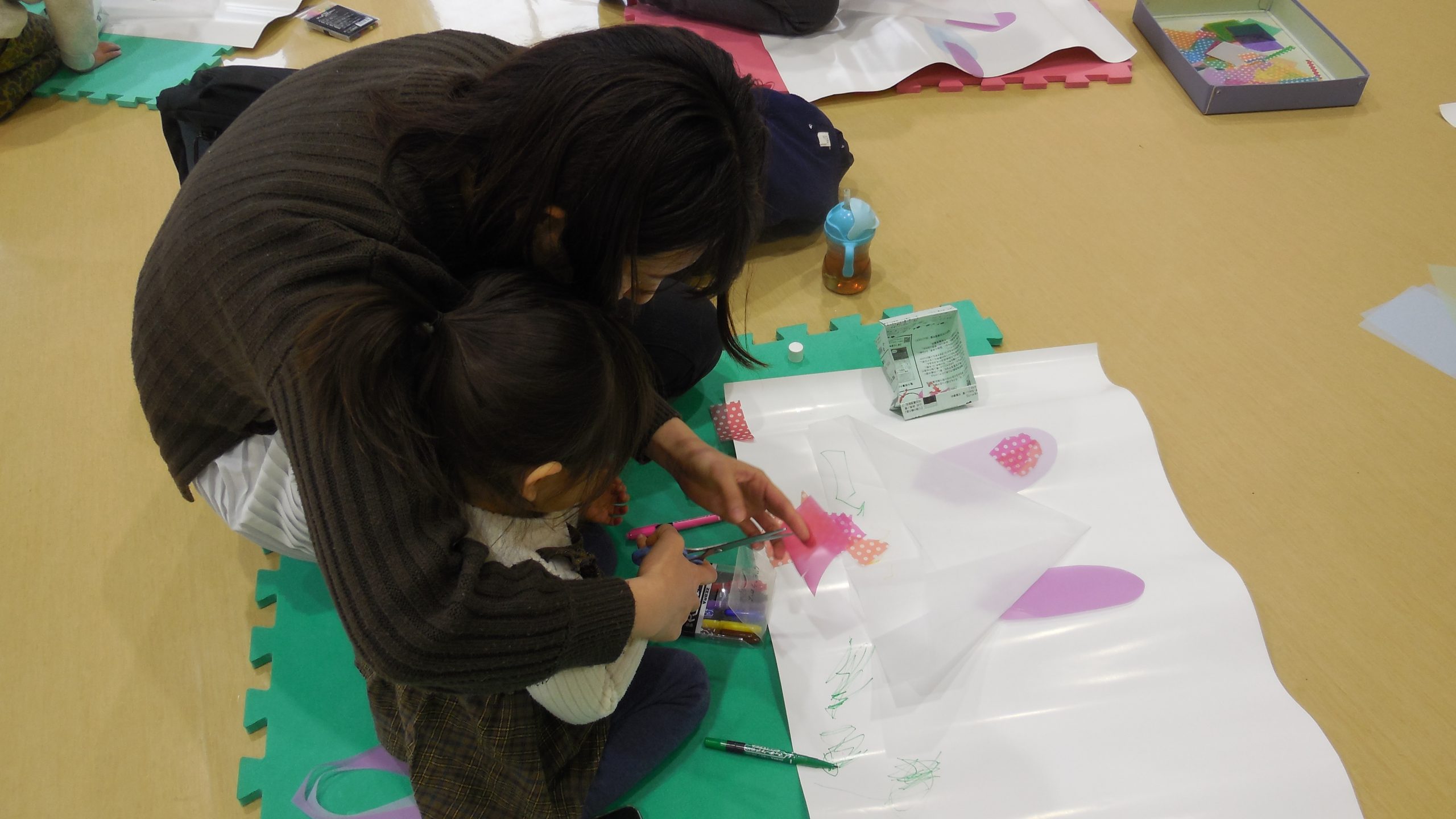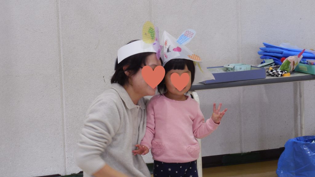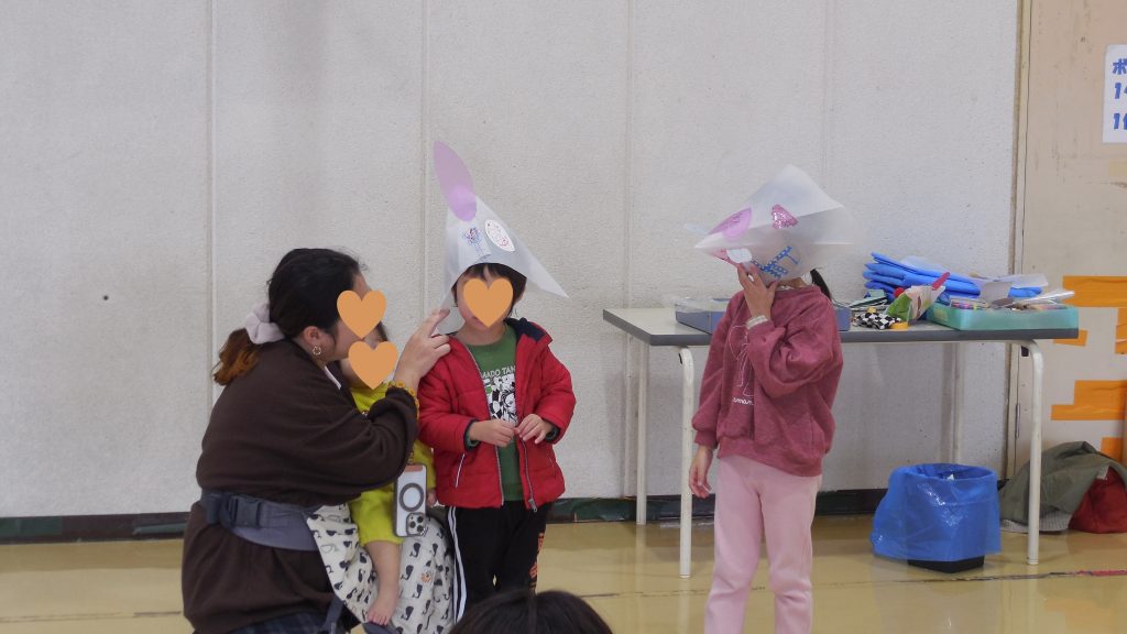 身近な素材で遊ぶことで子どもたちの発想が広がり、豊かな想像力が生まれました。子どもたちはお母さんと一緒に楽しみながら、それぞれ個性的で素敵な帽子が出来ました。