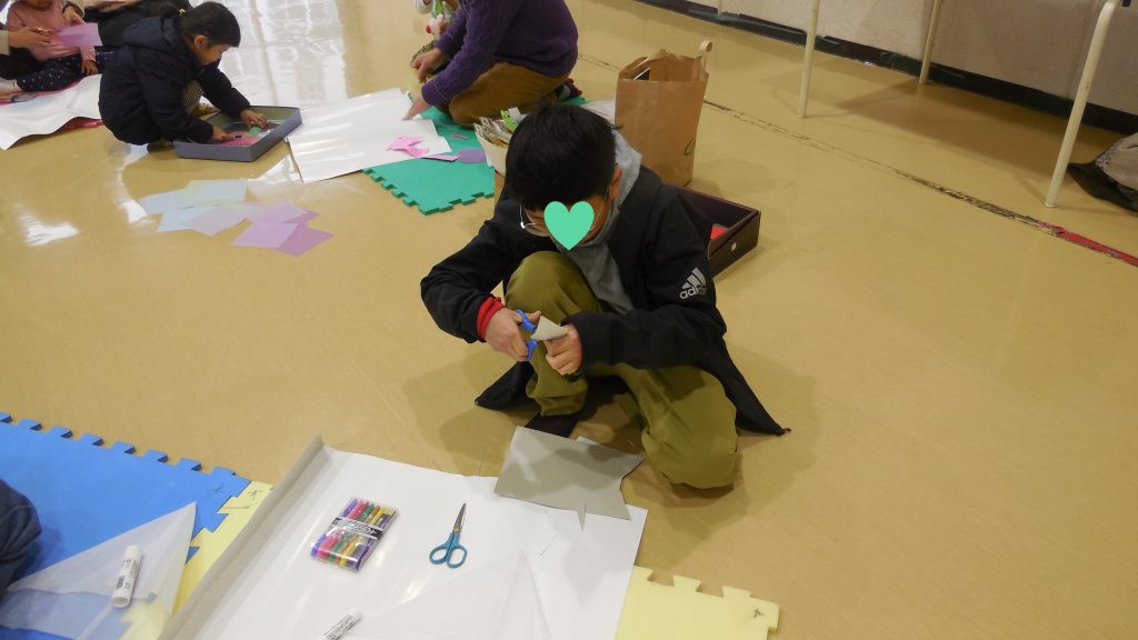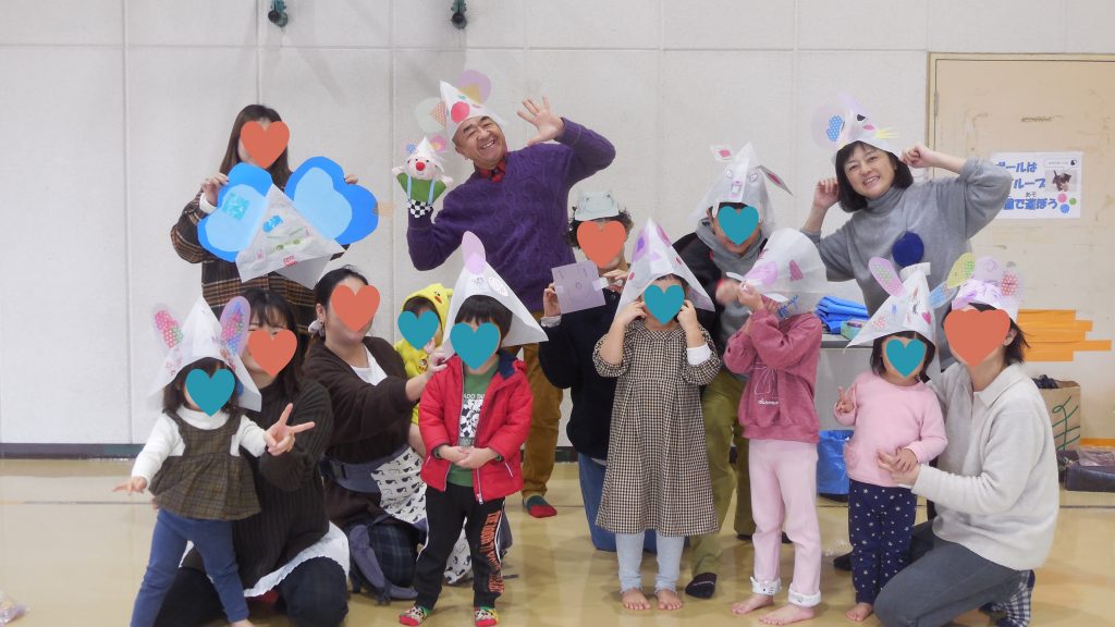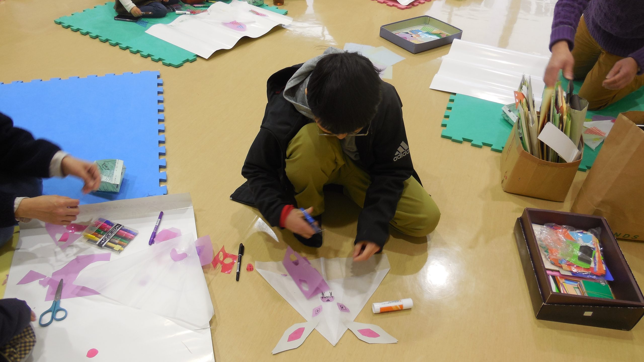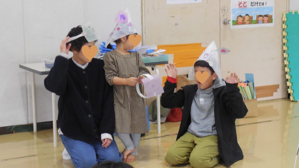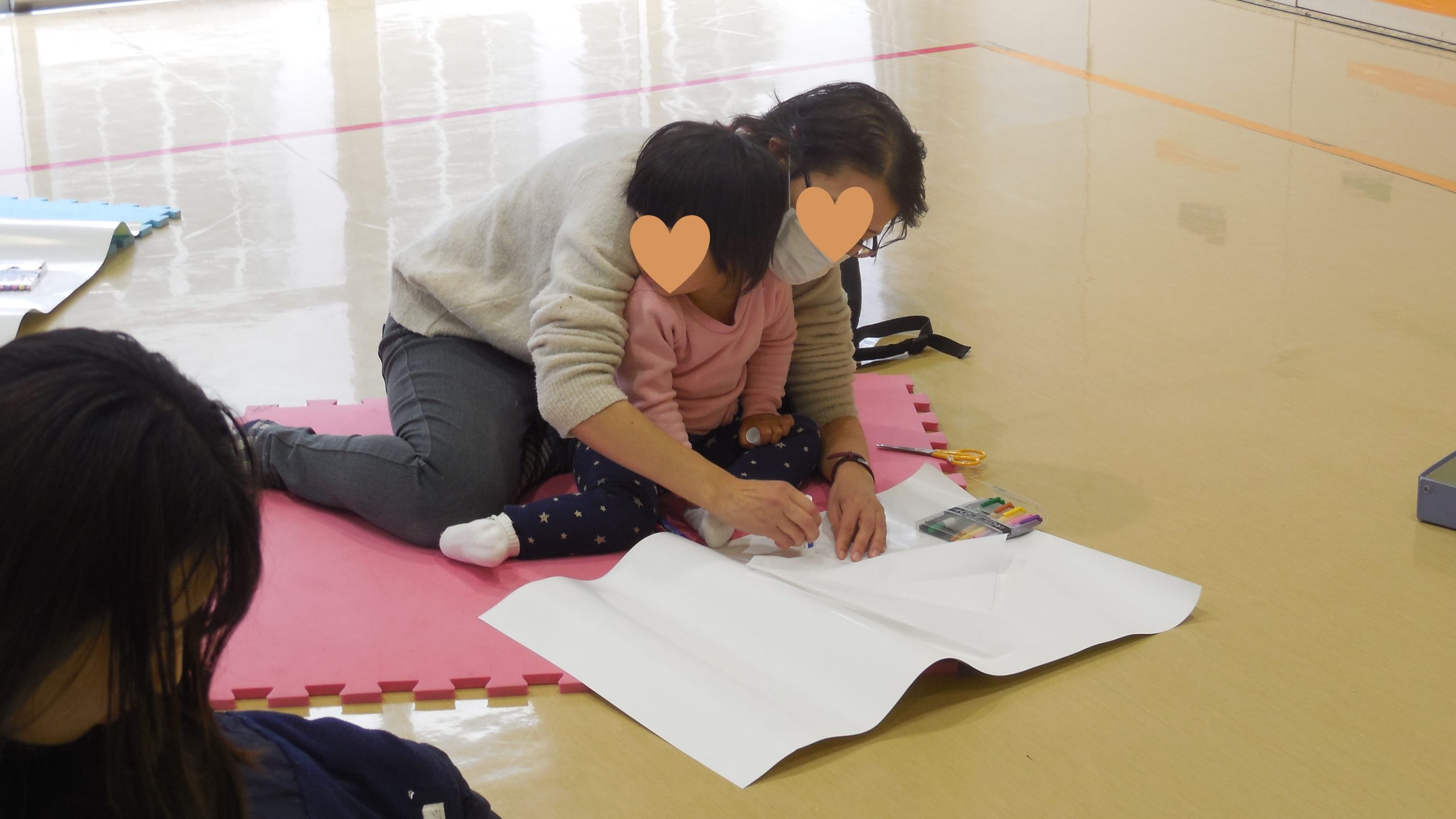 身近な素材で遊ぶことで子どもたちの発想が広がり、豊かな想像力が生まれました。子どもたちはお母さんと一緒に楽しみながら、それぞれ個性的で素敵な帽子が出来ました。