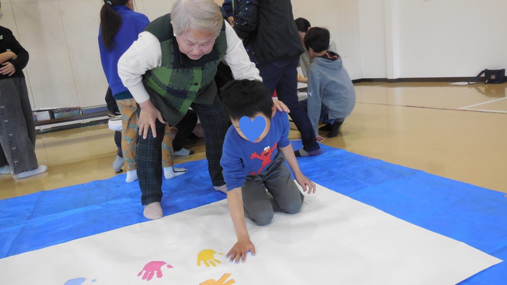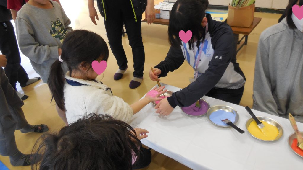 好きな色を選んで手に絵具をぬって・・・